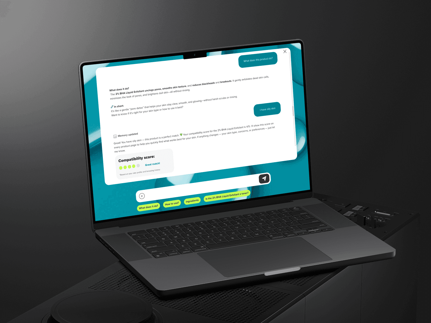 Ingredient Education Mode: Allows users to ask, “What does salicylic acid do?” and get digestible, evidence-backed answers without leaving the page.