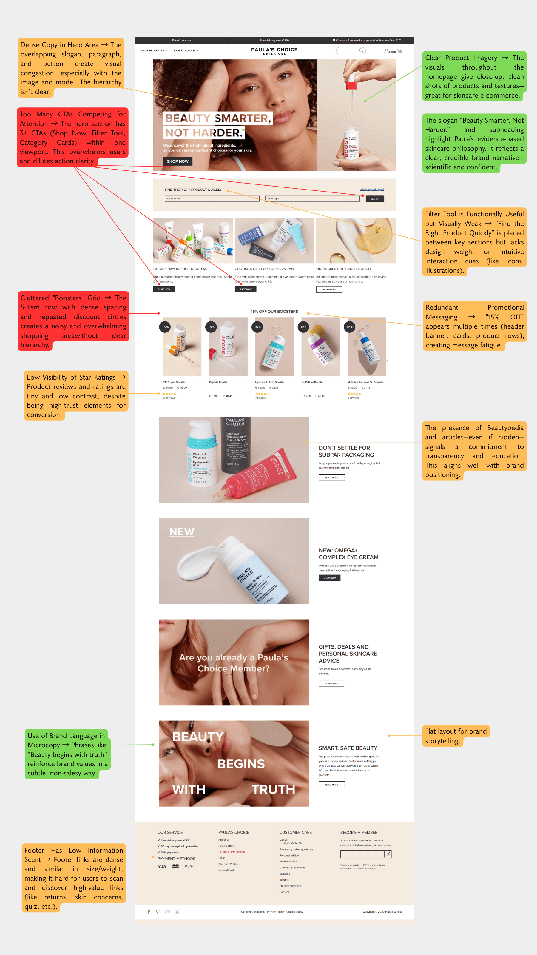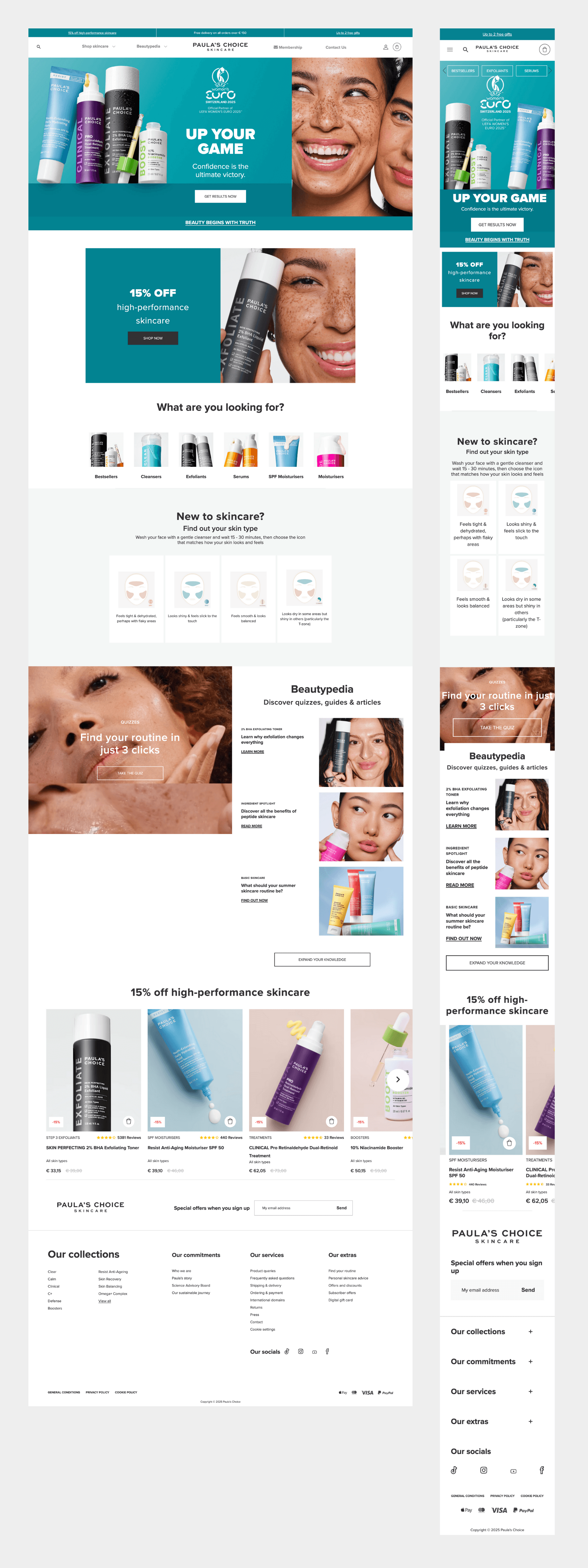 As the only UX Designer at Paula’s Choice Europe (now part of Unilever Prestige), I led a full redesign of our e-commerce homepage. The previous version, though functional, felt outdated and disjointed. With evolving business needs and increased focus on brand storytelling and discoverability, our team initiated a comprehensive revamp to modernize the page without compromising conversion.
